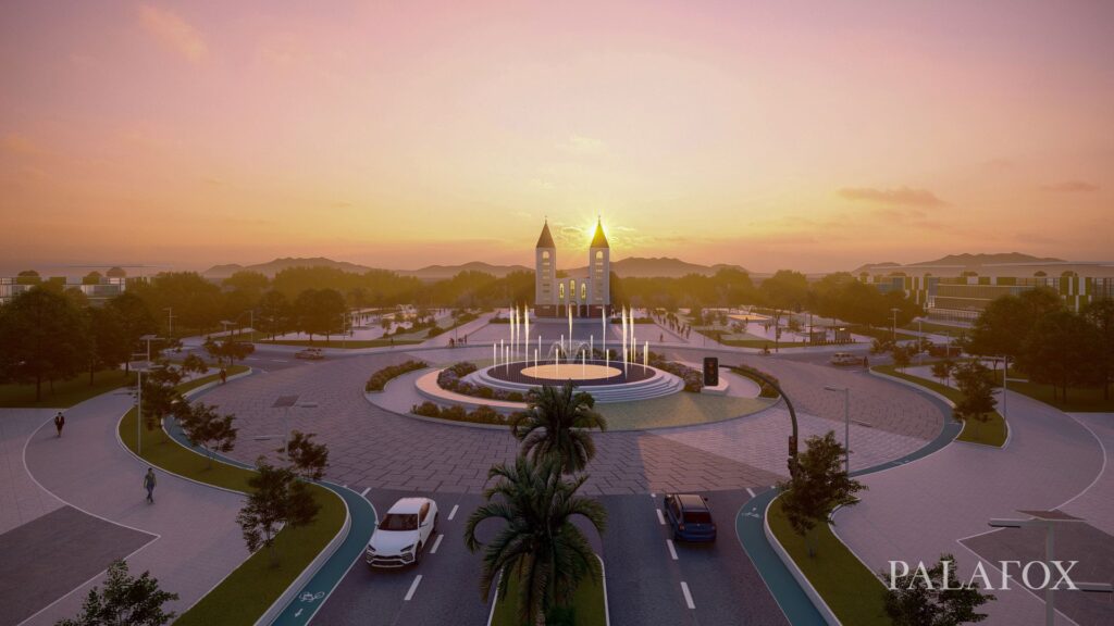 The conceptual development as shared by Palafox will celebrate the existing parish, a stunning replica of the famed church in Medjugorje, Bosnia.